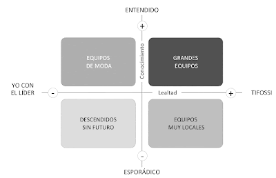 Están en el otro extremo del Eje, y es el menos habitual de los públicos. Conocen a fondo el fútbol, valoran el talento allí donde esté, aunque no sea en su equipo. Sólo se toman la molestia de opinar entre sus pares. Son fieles a sus colores pero anteponen ver buen juego a los buenos resultados (y si no que se lo digan a Capello). Son capaces de cuestionar al entrenador si el equipo no juega bien aunque gane. Están dispuestos a disculpar errores si hay un verdadero proyecto a largo plazo. Consideran esenciales los valores que definen al Club y no transigen en este terreno. El mejor ejemplo en otro sector es Apple, donde la deficiente cobertura de sus teléfonos no le ha supuesto el abandono de sus fieles. Su imagen, su estilo y su compromiso con la innovación se traducen en una sólida lealtad. El Entendido, de ser identificado, supone además una enorme ayuda a la hora de establecer estrategias o valorar o definir nuevos productos. Sin duda son el mejor aliado para alcanzar el éxito y hay que saber cuidarlos. En fútbol, sólo el Real Madrid y el Barça cuentan con una masa crítica significativa de los mismos.